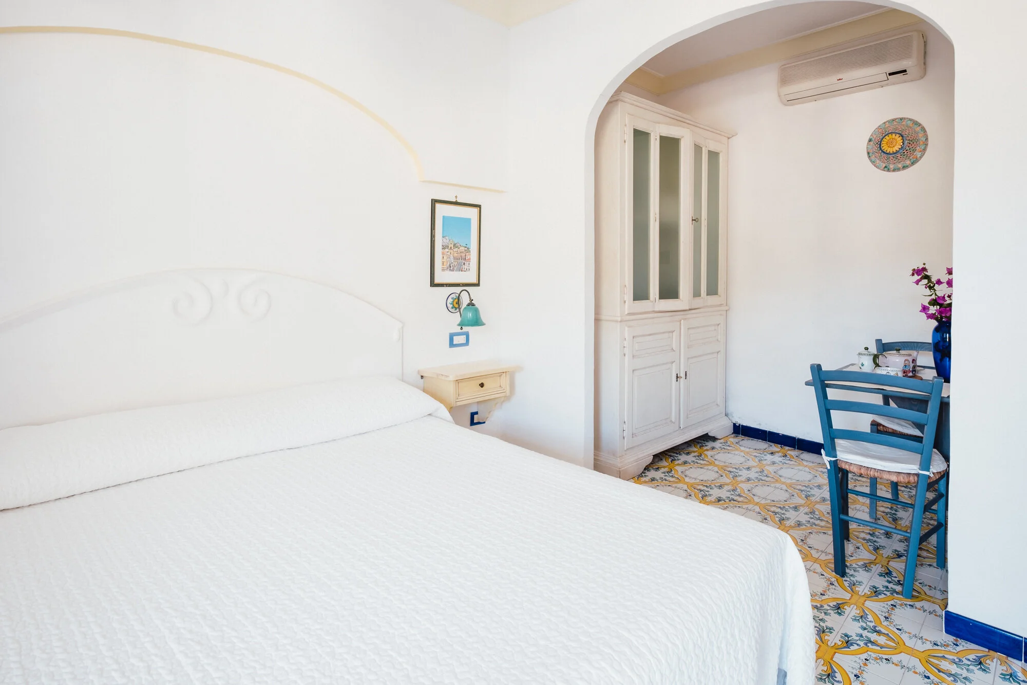 The vivid design of local Vietri majolica floors, contrasting the whitewashed walls with their pastel décor, blend well with the natural surroundings of lemon and olive groves.